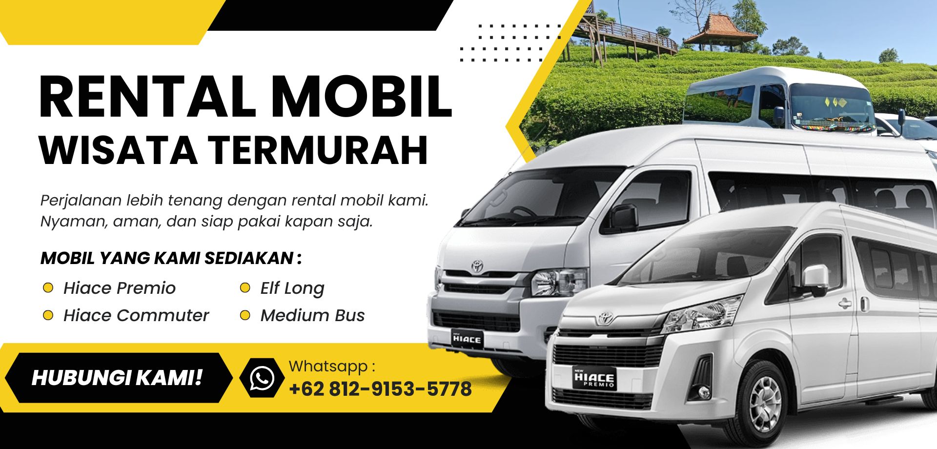 Nikmati perjalanan wisata dengan armada bersih, terawat, dan nyaman, harga ramah di kantong, serta layanan profesional. Cocok untuk liburan keluarga, rombongan, maupun perjalanan santai tanpa ribet. Pesan sekarang, liburan jadi lebih menyenangkan!